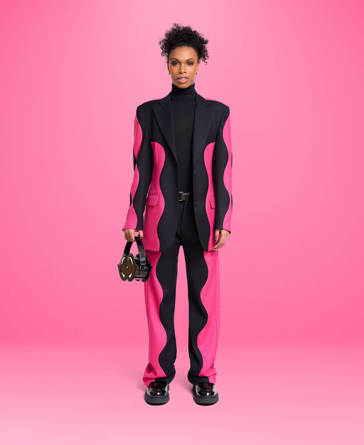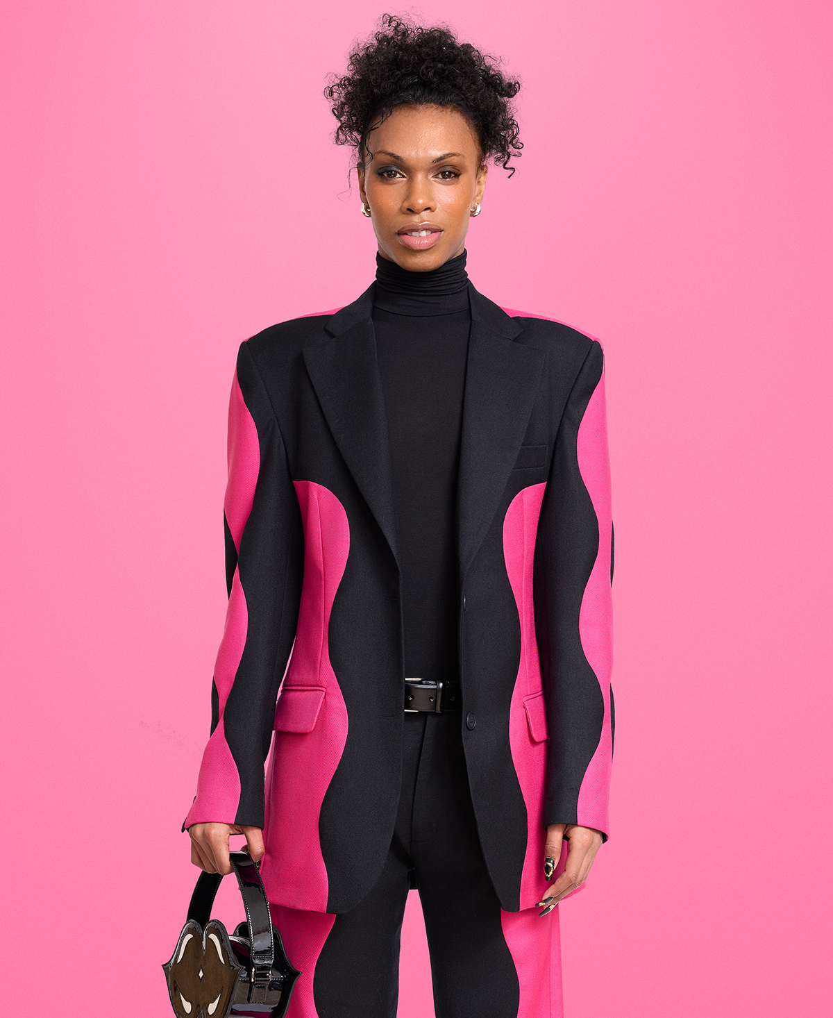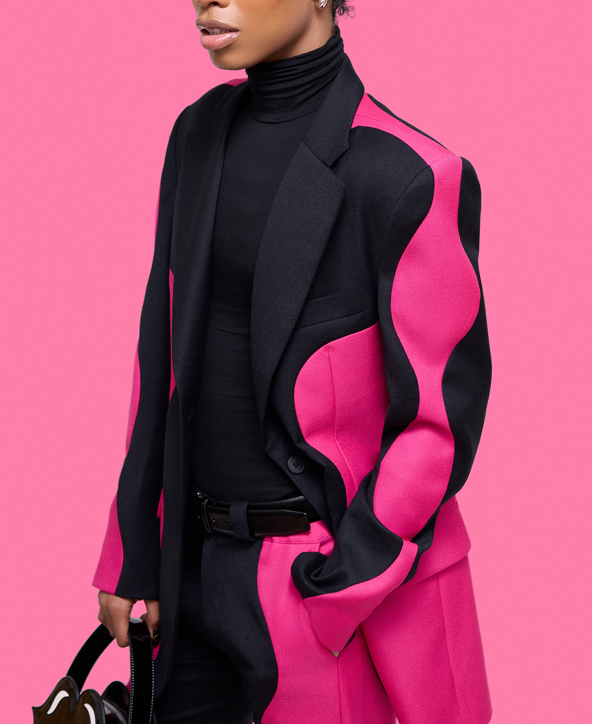 The pink and black patchwork blazer takes Jannike Sommar’s signature wavy pattern to unapologetic new heights, blending pop vibrancy with timeless elegance. Made for every body and every style, this versatile piece is here to slay. Serving maximalism and chic, it features a fierce patchwork design in vibrant pink and sleek black, all wrapped in a genderless, bold silhouette.